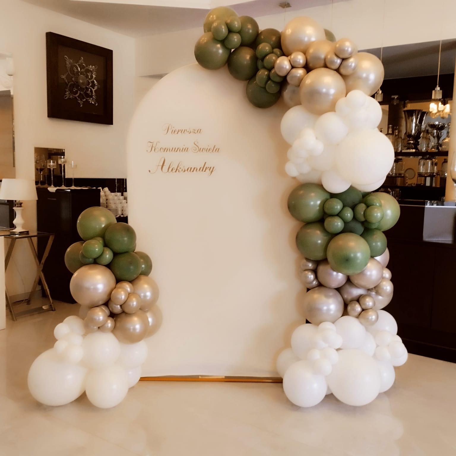 Nowoczesna i elegancka aranżacja, która podkreśla uroczysty charakter Pierwszej Komunii Świętej. Dekoracja tworzy spójną, estetyczną strefę do zdjęć oraz efektowny element wystroju sali.