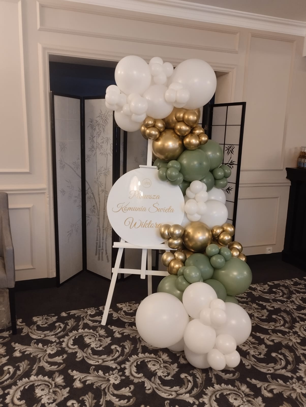 Elegancka i subtelna aranżacja przygotowana z myślą o wyjątkowym dniu Pierwszej Komunii Świętej. Kompozycja tworzy estetyczną strefę powitalną oraz doskonałe tło do pamiątkowych zdjęć podczas rodzinnego przyjęcia.