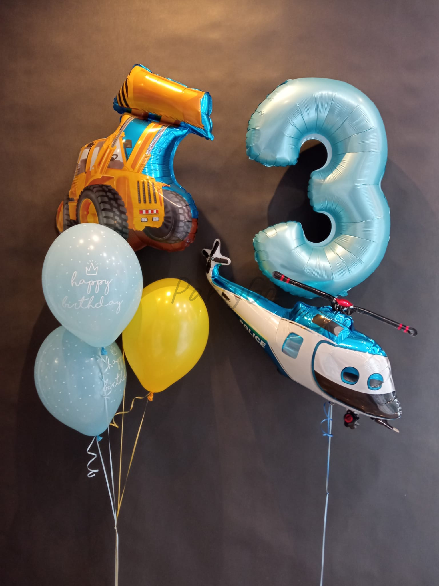 Kolorowa i efektowna kompozycja balonowa z motywem pojazdów, która z pewnością sprawi radość każdemu trzylatkowi. Balony w kształcie koparki i policyjnego helikoptera to idealny wybór dla małych fanów maszyn budowlanych i pojazdów ratunkowych.Centralnym elementem dekoracji jest duży balon foliowy cyfra „3”, który podkreśla wyjątkowy charakter urodzin.
