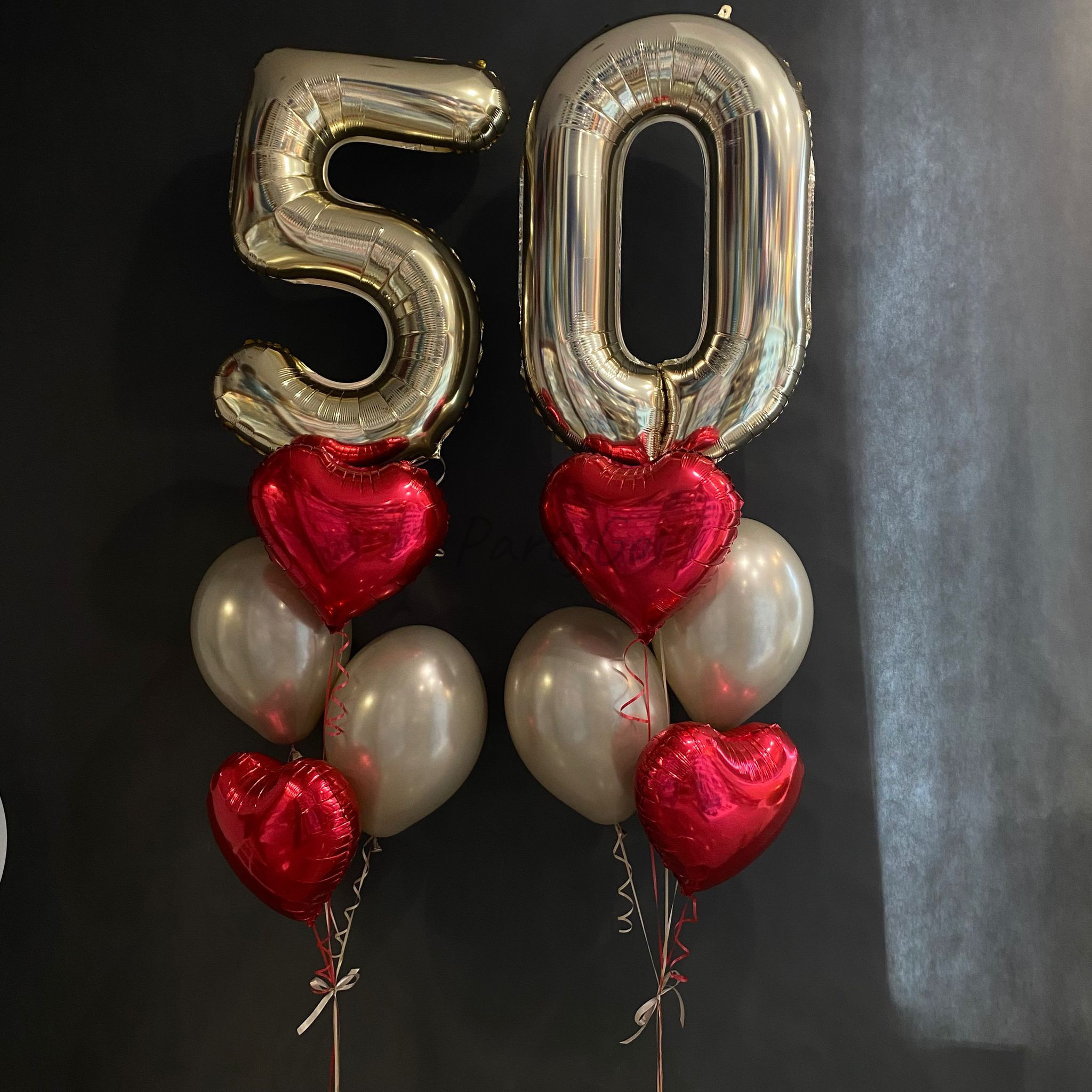 Elegancka i wyrazista dekoracja podkreślająca wyjątkowy jubileusz 50. urodzin. Połączenie koloru szampańskiego złota z czerwonymi sercami tworzy efektowną, a zarazem stylową kompozycję.