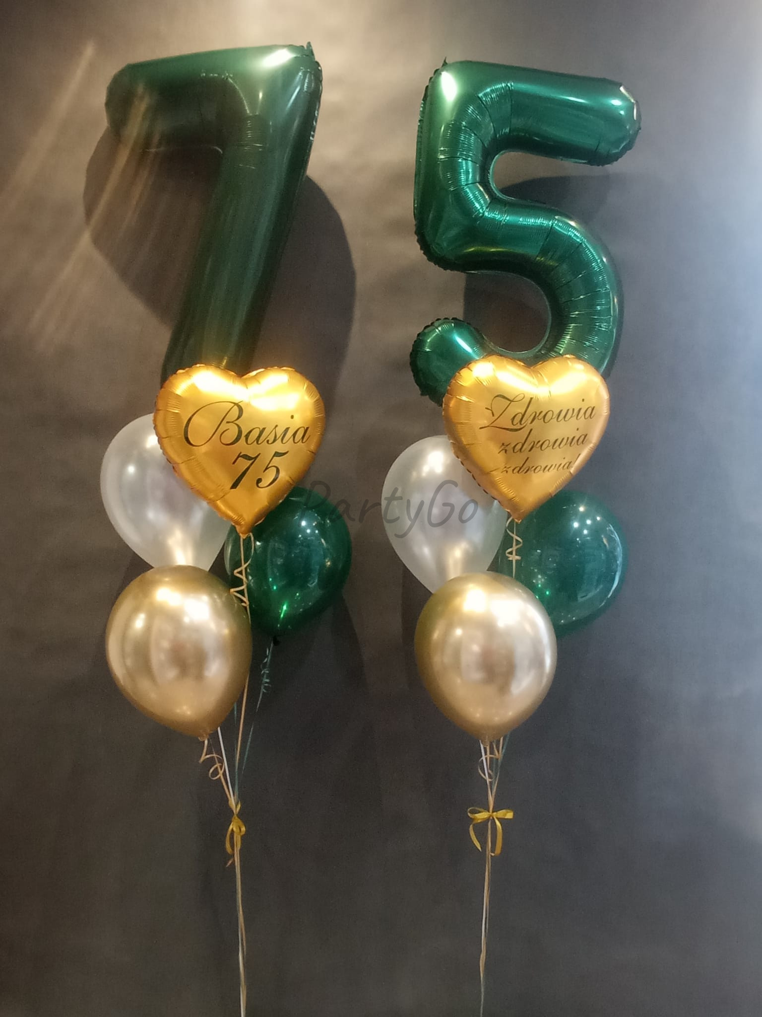 - Balony foliowe cyfry „7” i „5” o wysokości 85 cm